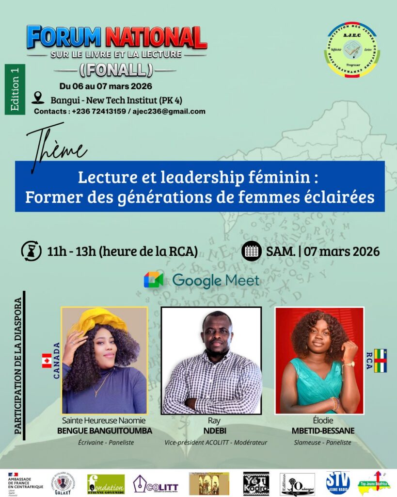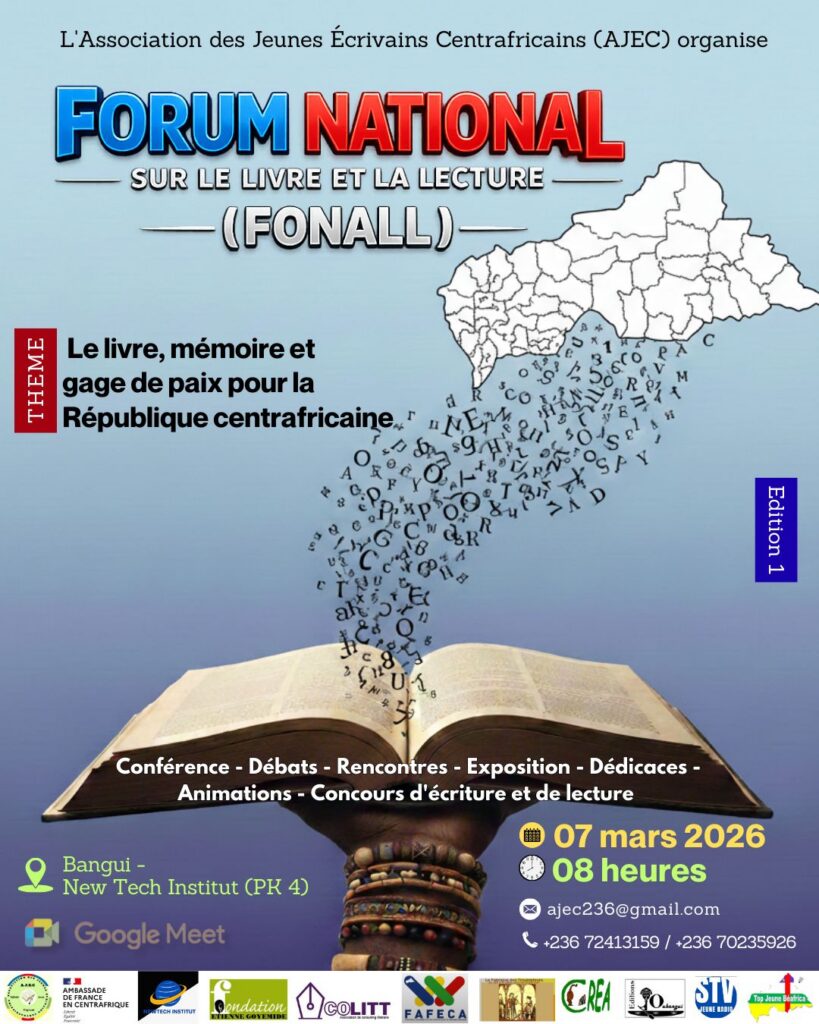 À Bangui, les 06 et 07 mars 2026, la capitale centrafricaine vibrera au rythme des mots, des idées et des débats à l’occasion du Forum National sur le Livre et la Lecture (FONALL). À l’initiative de l’Association des Jeunes Écrivains Centrafricains (AJEC), l’événement ambitionne de repositionner le livre au cœur du développement culturel et de la consolidation de la paix en République centrafricaine.