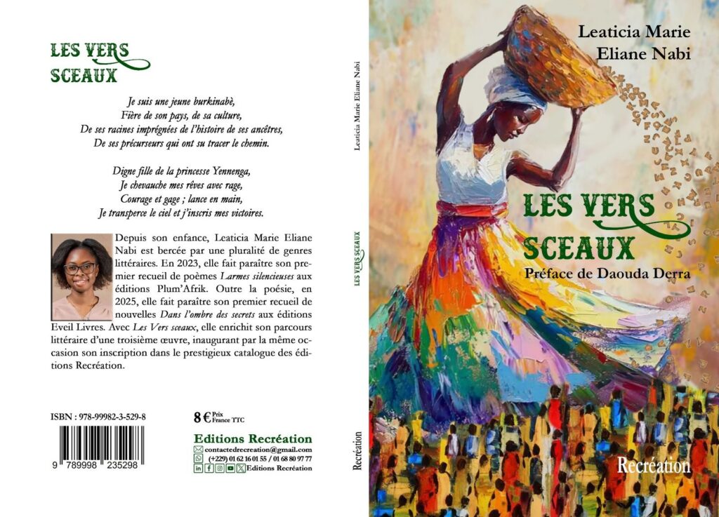 Depuis son enfance, Leaticia Marie Eliane Nabi est bercée par une pluralité de genres littéraires. En 2023, elle fait paraître son premier recueil de poèmes Larmes silencieuses aux éditions Plum’Afrik. En 2025, ce sera au tour de son premier recueil de nouvelles Dans l’ombre des secrets aux éditions Eveil Livres. Avec Les vers sceaux, elle enrichit son parcours littéraire d’une troisième œuvre, signant par la même occasion son inscription dans le prestigieux catalogue des éditions Recréation.